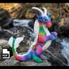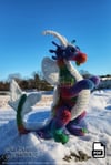 A Curvy Flying Dragon from this pattern is 11 inches tall from feet to top of head, 19 inches long from nose to tail, and 5 inches wide from shoulder to shoulder.